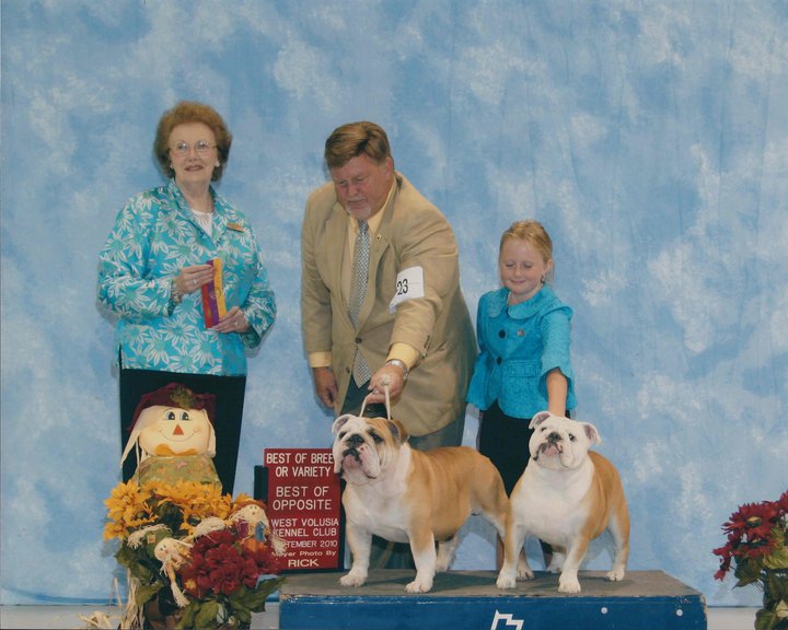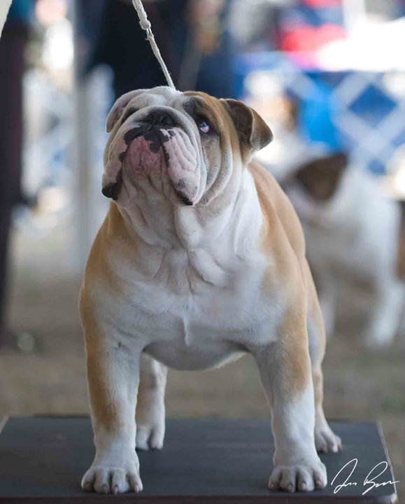 Bruiser started his show career in Florida at the age of 8 months old in December 2008. He won reserve his first 2 shows and won points at every show after that. He finished his Championship in July 2009. He is now invited to the 2009 and 2010 AKC/Eukanuba Championship in Long Beach California. He was shown very limited and had great success. Bruiser won his first Best of Breed from the Bred By Exhibitor class in Perry Ga under Mrs. Keke Kahn and went on to win a Group 3 that day. He has made us very proud with numerous Best of Breeds and is producing beautiful puppies.